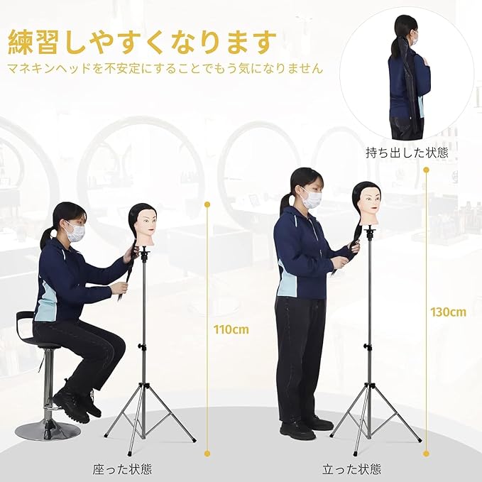 【信頼の安定性】高強度で耐久性に優れたアルミニウム合金製。三脚式設計と回転可能なヘッドで、さまざまな重量のマネキンヘッドを安定支持。高さは自由に調節可能(77.5~120cm)、立ってや座っての練習にも対応。美容練習やメイク作業に最適です。