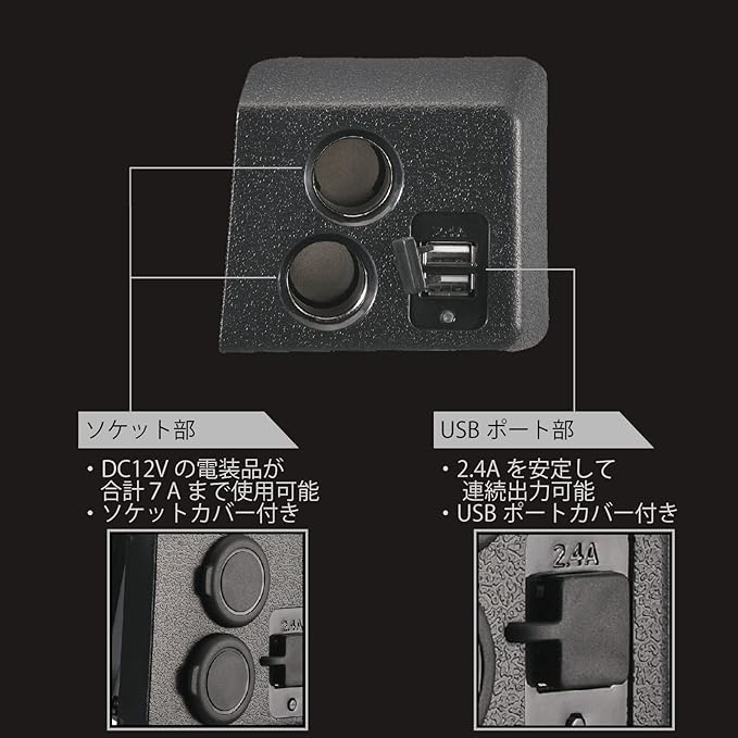 出力容量:2ソケット合計7Aまで・2USB合計2.4Aまで・2ソケット+2USB合計7Aまで