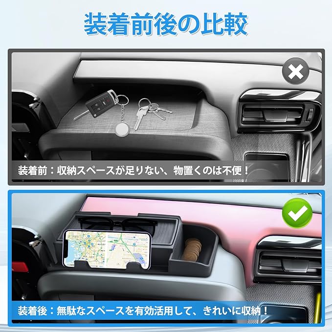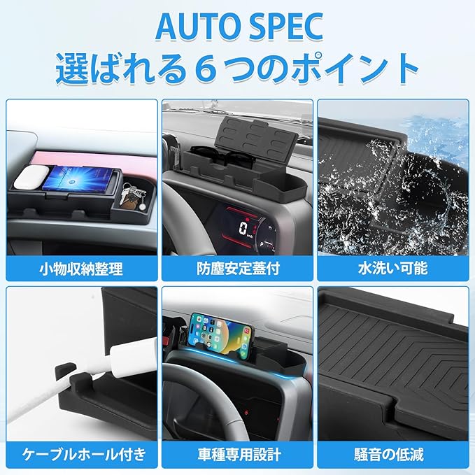 2.【蓋付き収納ボックス】:車内をいつもキレイに! ダッシュボードの無駄スペースが多機能収納に生まれ変わります。財布、鍵、小型手帳など、散らかりがちな小物をまとめて収納可能。蓋付きで安定感抜群、埃も防ぎます。スッキリ整理された車内で、快適なドライブ空間を実現!