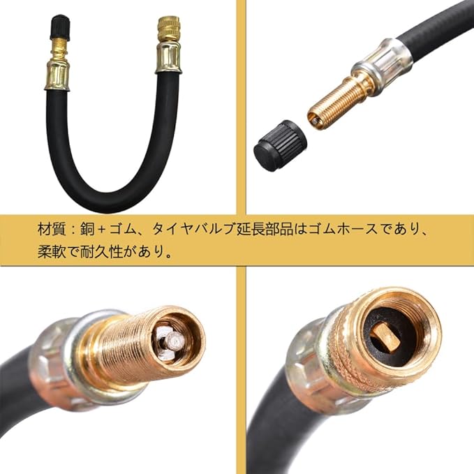 【高品質の素材】材質:銅+ゴム、タイヤバルブ延長部品はゴムホースであり、柔軟で耐久性があり。エアバルブは真鍮製で、キャップはステンレス製なので、耐摩耗性が強い、耐錆性、長い時間でお使い頂けます。