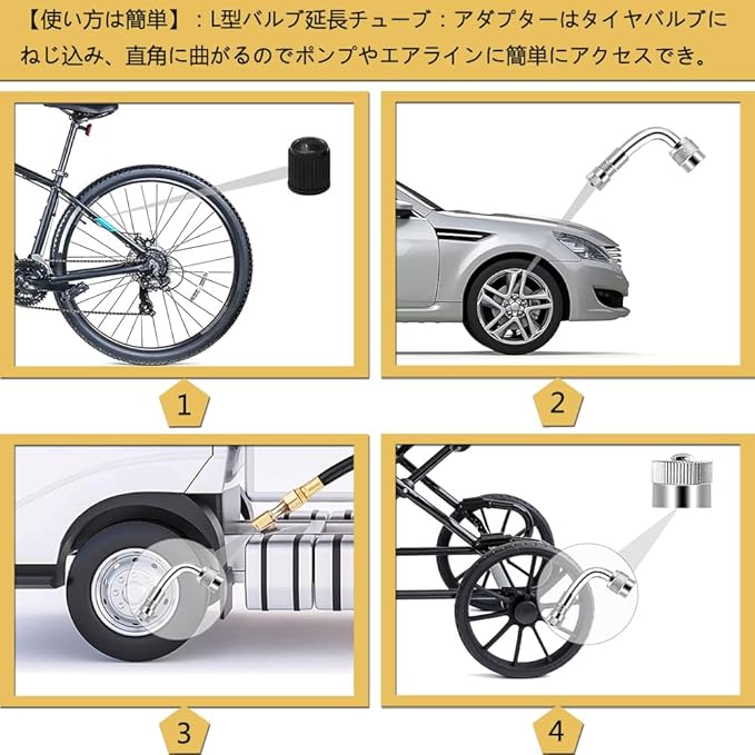 【使い方は簡単】L型バルブ延長チューブ:アダプターはタイヤバルブにねじ込み、直角に曲がるのでポンプやエアラインに簡単にアクセスでき。タイヤバルブ延長アダプター:一端はバルブステムに接続でき、もう一端は元のバルブステムの交換用として使用できます。