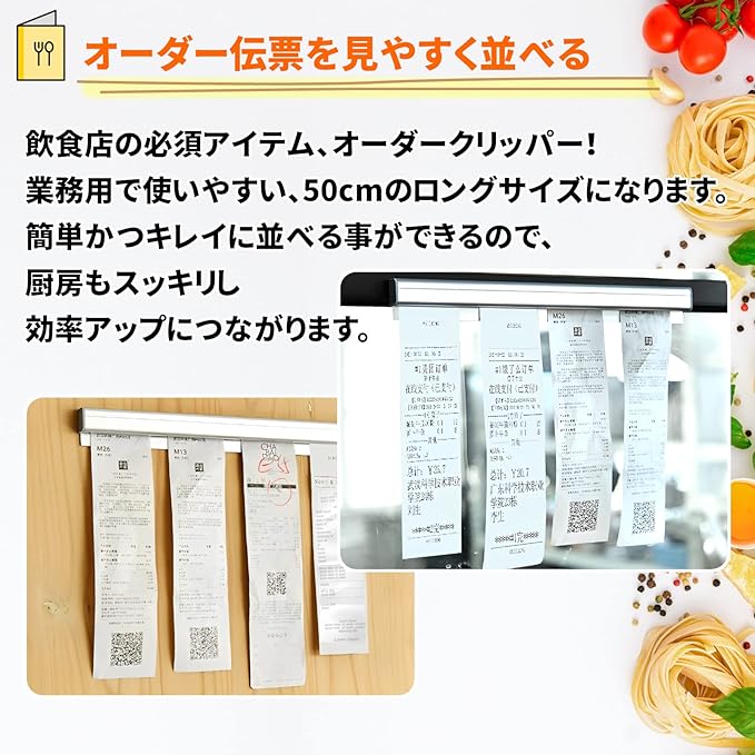 ・【オーダー伝票を見やすく並べる】飲食店の必須アイテム、オーダークリッパー!業務用で使いやすい、50cmのロングサイズになります。こちらの壁掛け伝票ホルダーを厨房に設置しておけば、注文伝票をクリップし、簡単かつキレイに並べる事ができるので、厨房もスッキリし効率アップにつながります。