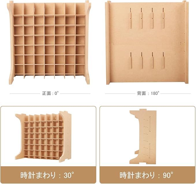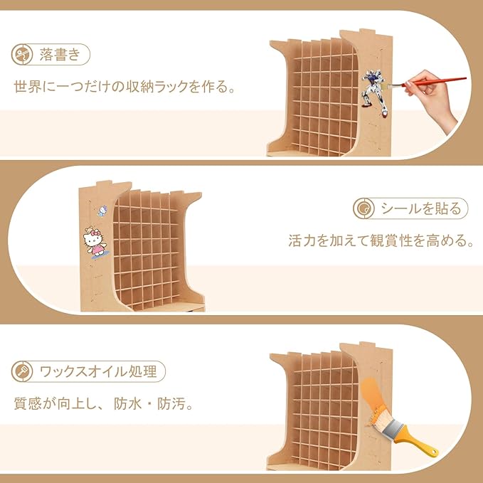 この木製品には、木に延性があるため、空気中の湿気の影響で1-2mm伸びますので、組み立てるときはサンドペーパーで磨いてからハンマーで軽く叩く必要があります。しっかりと結合してバラバラにならないようにするために、嵌合が厳しいです。●プラモデル道具収納ラックは未組み立ての状態でブロック毎の梱包と組み立て説明書が付属しております。説明書も図が付いていて分かりやすく組み立てやすいものとなっております。寸法がタイトなのでゴムハンマーなどがあれば組み立てやすいです。 ●木材の切断面が鋭い可能性があるため、手などの怪我にご注意ください。(作業前に紙ヤスリで軽く削ることをお勧めします。)●ご注意:説明書の内容順に沿って組み立ててください。●木材の特徴上、小さい傷や色の違いが生じることがありますが、不良ではありません。ご了承ください。●受け取った製品に問題がある場合は、お気軽にカスタマーサービスチームにご連絡ください。24時間以内に返信いたします、できるだけ早く問題を解決できるよう最善を尽くします。