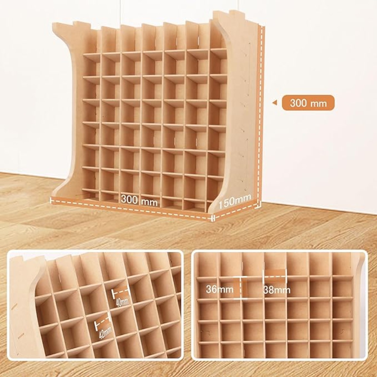 この塗料ラックは長さ30cm *高さ30cmです。全7段で各段7本、計49本収納可能のラックとなっております。各格子が36mm*38mmであるため、10ml TAMIYA/10ml MR HOBBY/18ml MR HOBBY/10ml gaia/18ml JUMPWIND塗料など、直径36 mm未満のボトルを収納できます。