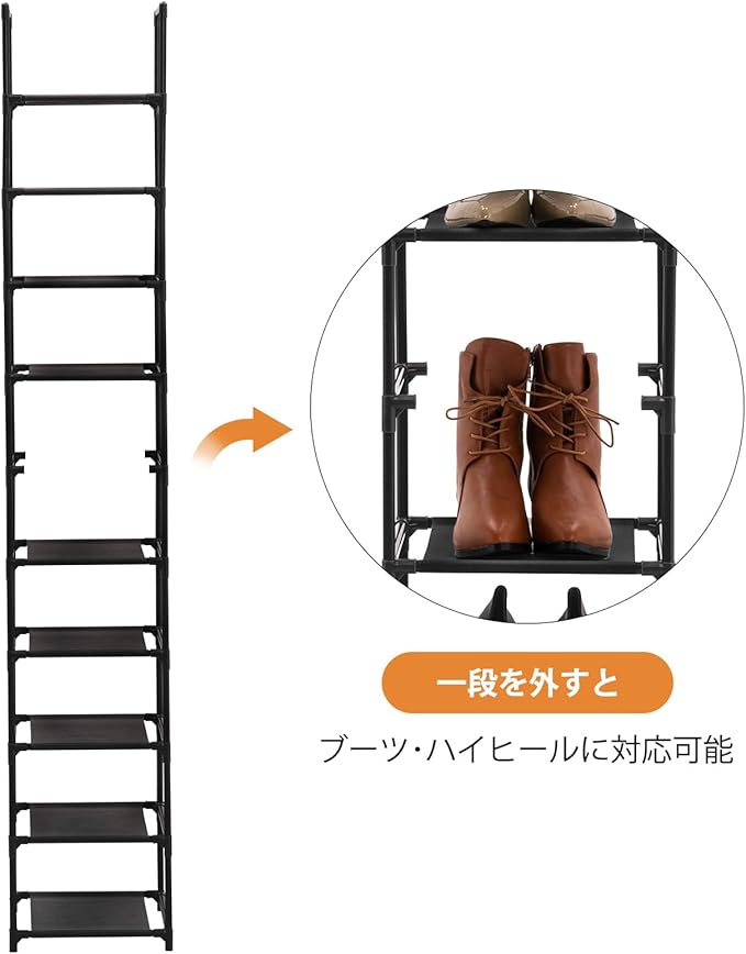【棚数を自由にアレンジ】お好みのように棚の数を自由に調整し、2つの靴収納ラックに分けて異なる部屋に配置するできます。一つの棚は取り外せて、ブーツなども収納可能です。お勧め:棚の数が多い場合、下から上まで重い靴を置いたら安定性がよりよいです。