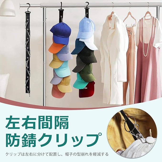 【左右間隔の防錆クリップ】上から8つのステンレス製クリップは左右に分けて配置し、圧迫による帽子の型崩れを軽減するのに役立ちます。防錆性抜群で耐久性に優れ、錆びにくい同時に帽子に傷つけずに帽子ディスプレイに最適な帽子掛けです。