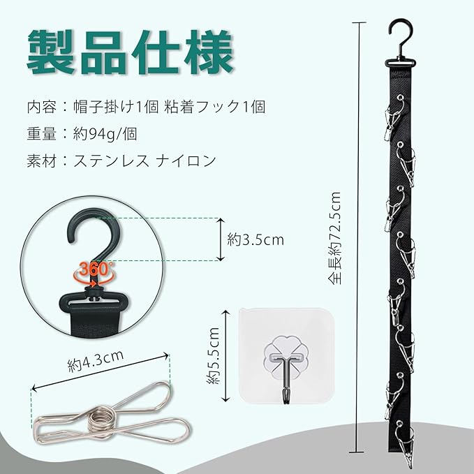 【360 回転フック】上部に360 回転可能のフックが設置され、収納場所に合わせて調整でき、帽子の選択と取り外しが容易になります。この帽子掛けは耐久性ナイロンで細かく縫製され、破れにくく長期使用に耐えられます。