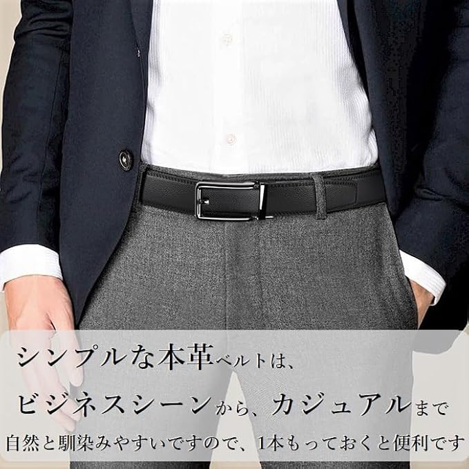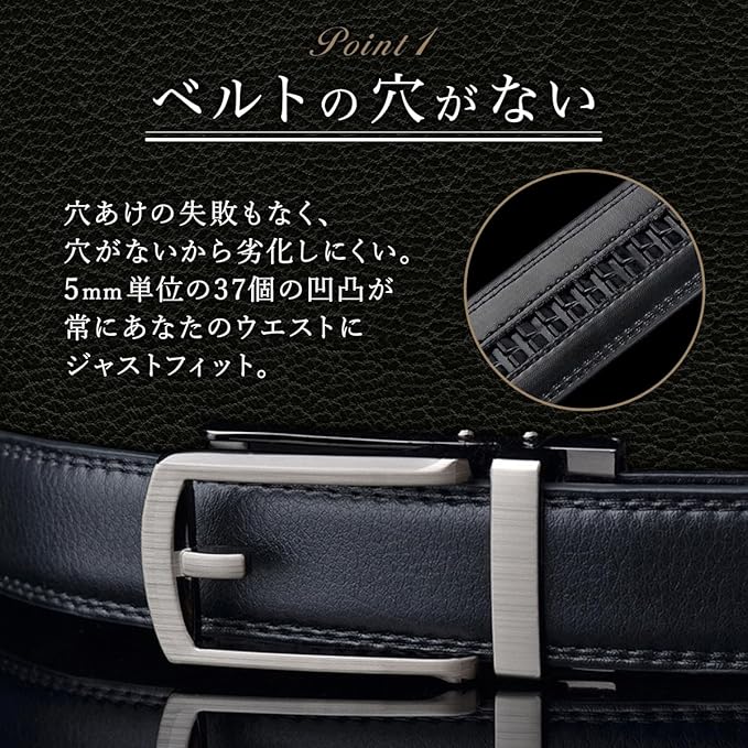 【新型の自動バックル】いつでも微調整ができるオートロックベルト。バックル部分についてるレバーを指で持ち上げるとベルトを引っ張るだけでサイズ調整が可能なクリックベルト。クリックベルトなので、ご使用の便利さは卓抜です。無段階調整で穴なしなので緊急の場合では失礼なく紳士的なイメージを保つことができる紳士ベルト。