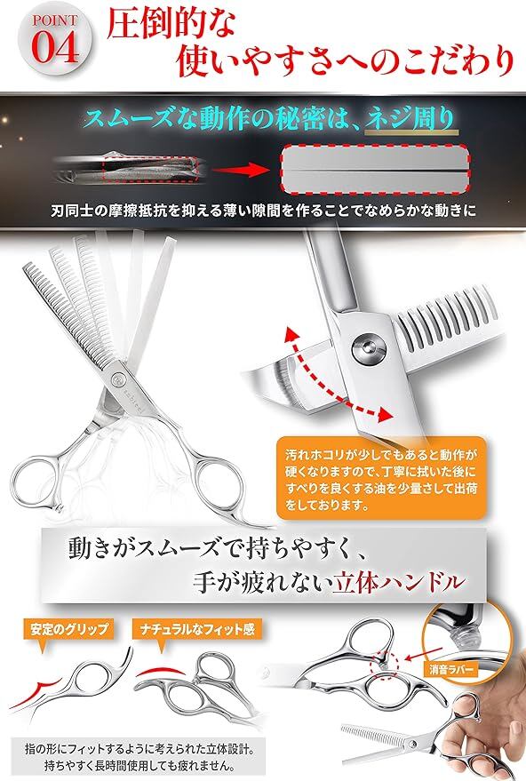 【プロ美容師が総監修】当店のすきばさみは現役のプロ美容師が総監修しています。プロが使うハサミと同様に、『使いやすさ』と『切れ味』の両方を満たしているすきばさみとして60種類以上の調査を経て選ばれたプロも認める1本です。初心者の方にも安心してお使いいただけます。