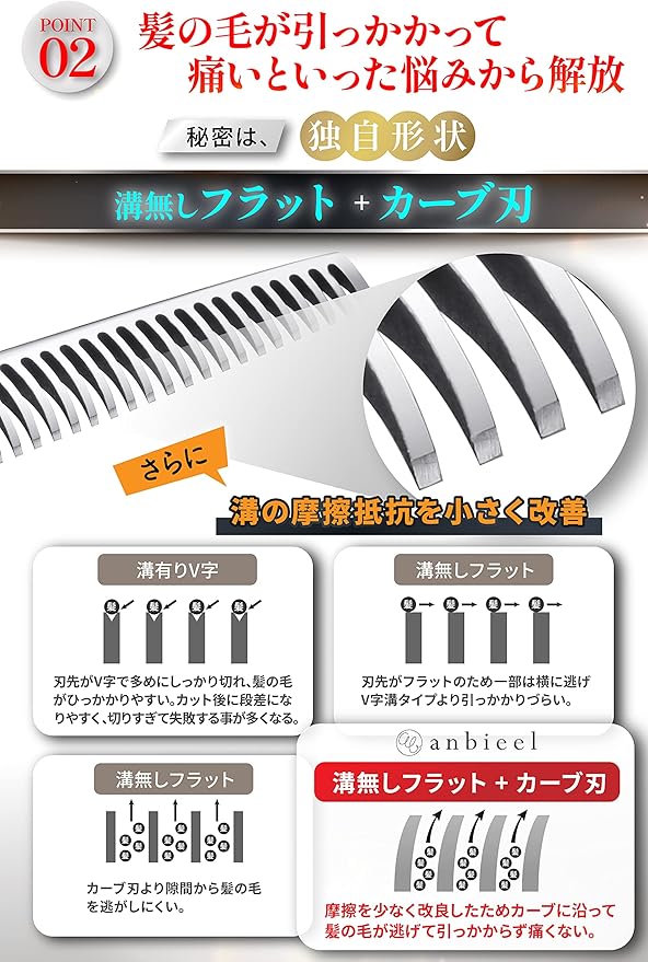 【髪の毛に引っかからない溝無しフラット+カーブ刃】刃先を溝なしフラットにすることで髪の引っ掛かりをなくすだけではなく、独自形状のカーブ刃を取り入れさらに摩擦を少なく改良。髪の毛が逃げて引っ掛からず痛みを感じないように開発いたしました。