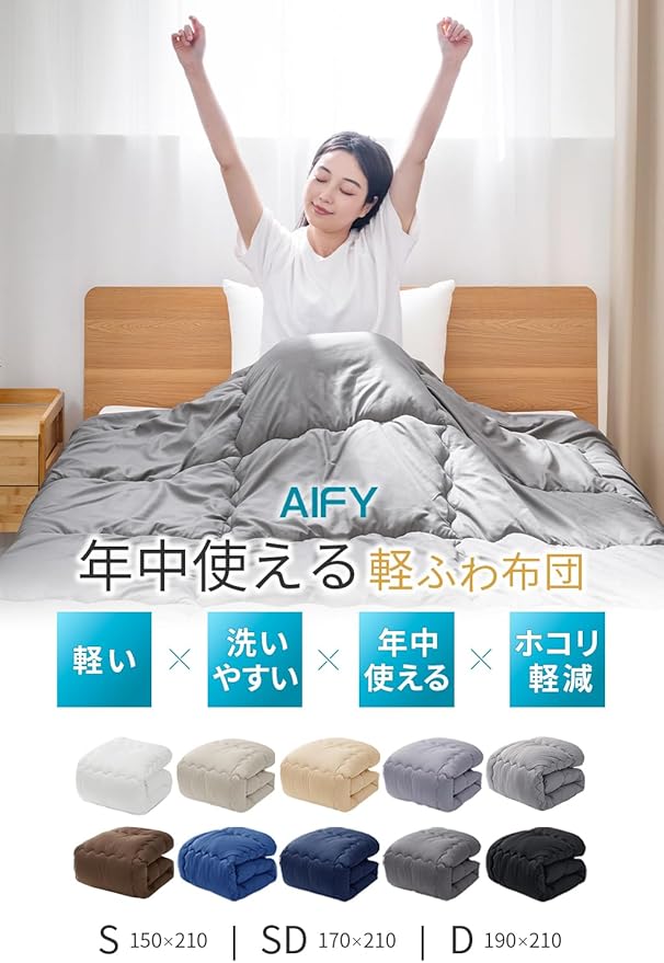 AIFY 掛け布団 ダブル 冬 190 210cm 【合掛け・オールシーズン】暖かい 洗える 軽量 抗菌 防ダニ 通気 【SEK認証】 グレー (約2.4KG)