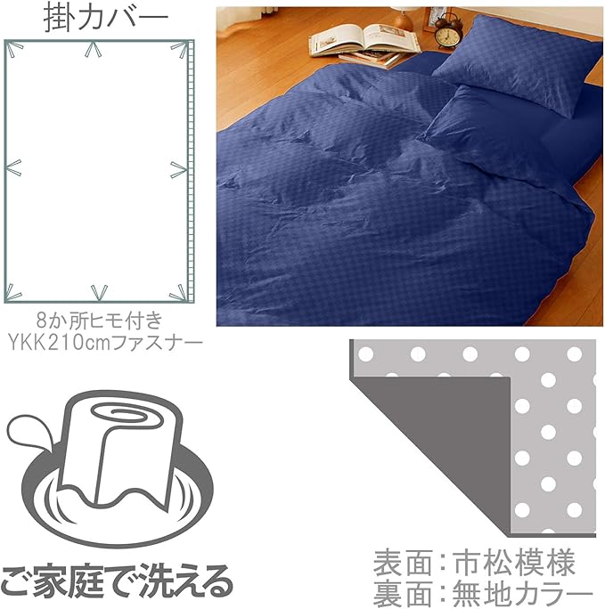 掛布団カバーの内側は8か所ヒモ付き。布団とつなげて使用中のズレ防止。布団の出し入れがしやすい片側全開ファスナー。<br>ベッドシーツはマットレスへの装着が簡単な全周ゴム。<br>枕カバーは合わせ式。(ファスナー無)
