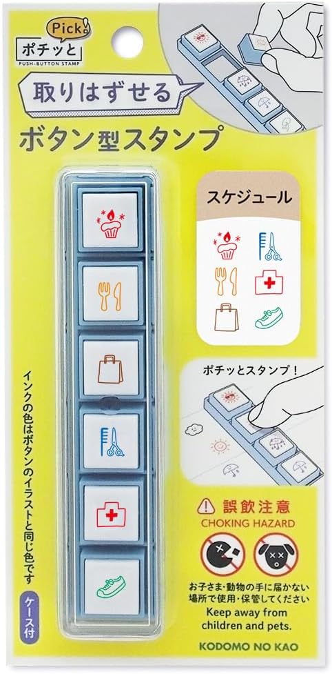 ポチッとシックスの進化版スタンプ「ポチッとPick!」はボタンを取り外すことができるようになりました。 6個のボタン型スタンプが枠にカチッとはめてあり、スタンプがはずれてバラバラにならないように、透明のケースに入っています。 透明ケースから本体を取り出して、紙の上にのせイラスト部分を指で上から押すとスタンプできます。スタンプ1個ずつ取り外し可能なので、枠から外して押したり位置や向きを変えて枠にもどすこともできます。