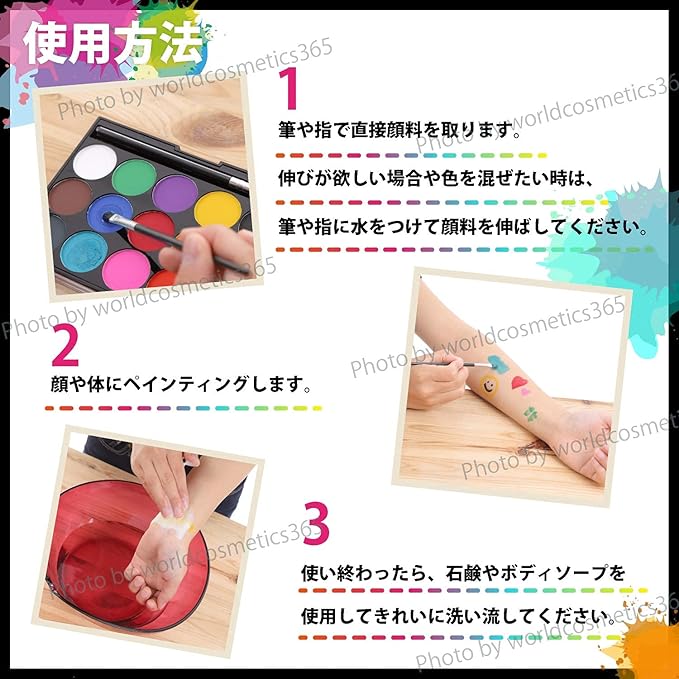 当商品は水性のフェイスペイントです。水やぬるま湯で簡単に洗い落とすことができます。落ちにくい場合は石鹸やボディーソープのご使用をおすすめします。