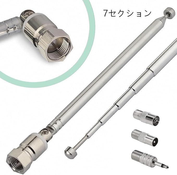 【製品名】Fヘッド伸縮式アンテナ4個セット(Fメスイヤホンヘッド、FメスTVヘッド、FメスTVマザーを付属)。展開セクション数:7セクション。