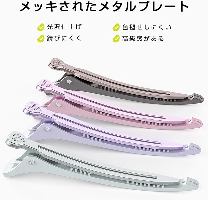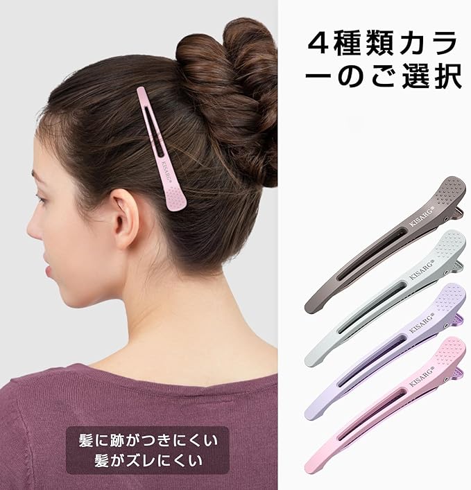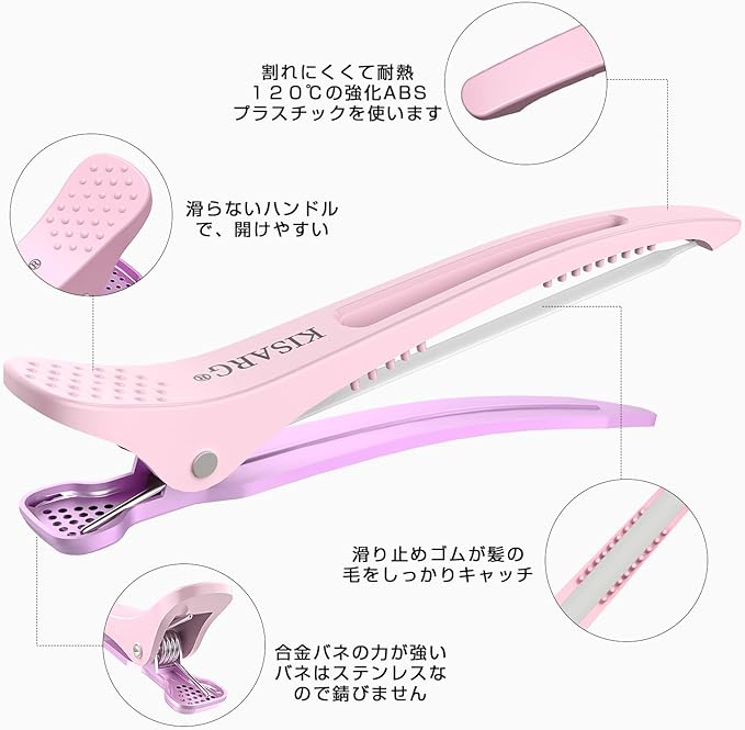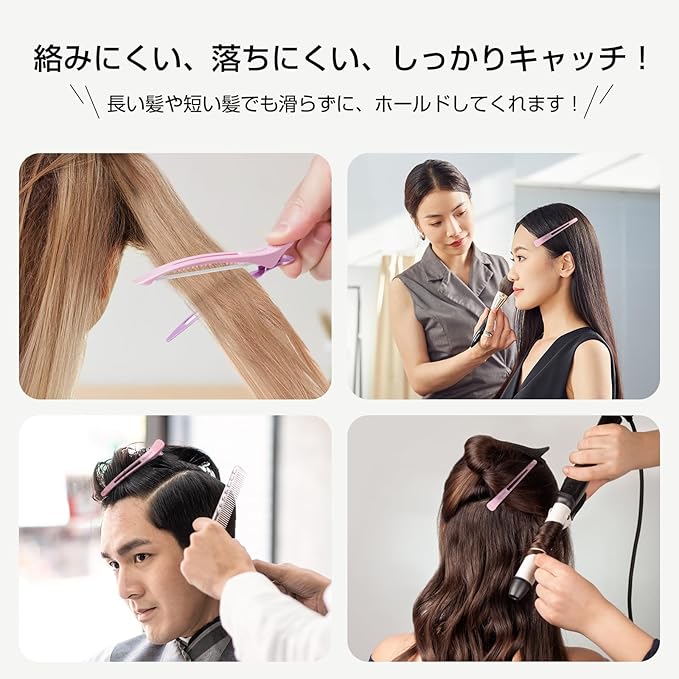 【快適でしっかりとまる】強力バネとシリコンバンドの組み合わせで、濡れた髪でも乾いた髪でも、しっかりホールドできます。 挟む時、先端が頭に刺さらなく、頭皮を傷つけません。外す時、シリコンの滑り止め付きで髪の引っかかりや絡まりを防ぎます。これらのヘアクリップは、髪を分けてしっかり留めるのに最適です。