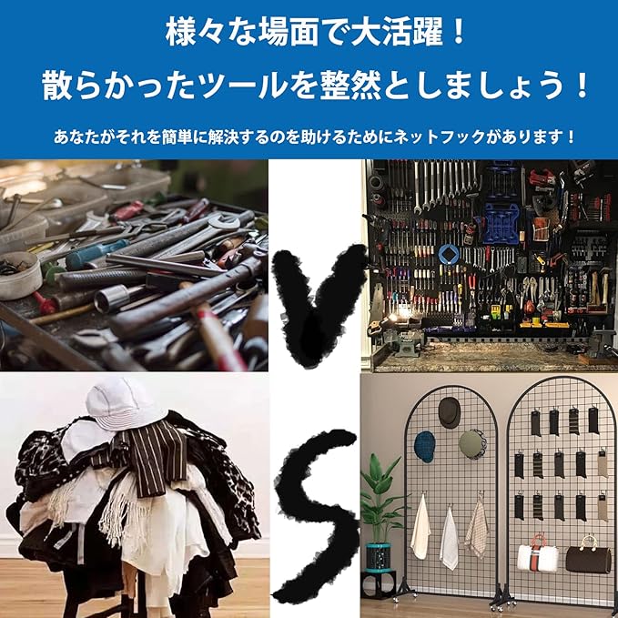 【省スペース、スペースをフル活用】頻繁に出し入れする道具とメッシュパネルは相性が抜群です。料理中、サッと取り出したい調理器具や、毎日使用する子どもの上着や帽子、通園グッズ。小物収納やガレージの工具収納、お店の陳列などにもご使用可能です!壁に多くの物品を弔り下げ、各種の工具と設備を正確に組織することを助け、あなたの時間と空間を節約することができる。帽子やバッグ、ヘッドホンなどの壁掛け、キッチン用品や洗面用具などの収納、また店舗での商品の陳列や展示用にもお役立て頂けます。