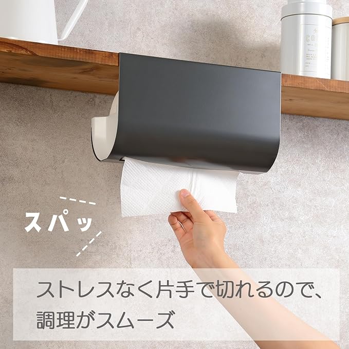 キッチンペーパーはロールタイプで直径12㎝ 幅24.5㎝以内のものをご使用ください。棚板の厚み2.5cm以下、後ろに12cm以上の空きのある場所に取り付けてください。最大積載重量:1㎏