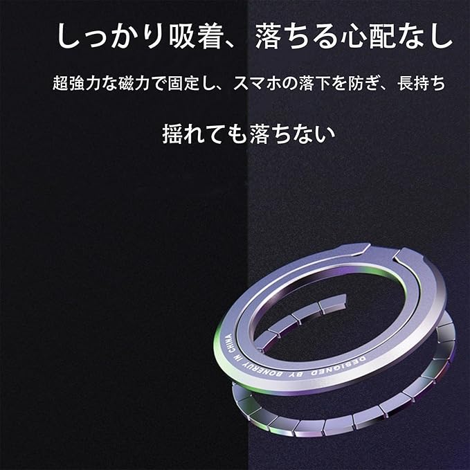 こちらのマグネット式スマホリングは磁力が強化されており、しっかりと吸着して簡単には外れません。セットには磁気誘導リングが付属しているため、MagSafe非対応のスマートフォンでも問題なく使用できます。製品全体は金属素材で作られており、色落ちしにくく、見た目も美しく、粘着跡が残らないのでスマホを傷つける心配もありません。360度回転と180度折りたたみが可能で、より便利に素早く使用でき、持ち運びや収納にも場所を取りません。自分用としてはもちろん、ギフトとしてもおすすめです。