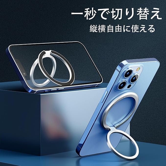 【360 回転&180 折りたたみ】マグネット式スマホリングスタンド強力マグネット内蔵で、安定感抜群!吸着力がさらに強化されており、落下の心配なし。セットに付属の引磁リングを使えば、MagSafe非対応機種でも簡単に取り付け可能。