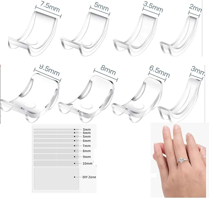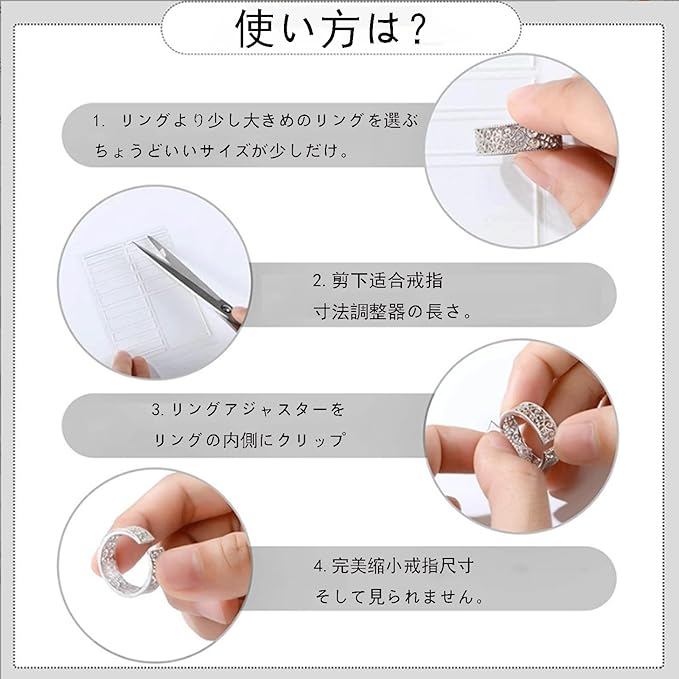 【入数】 テープ仕様17枚で、貼るだけ使用でき。またDIYエリアも用意、幅・長さ・形状を自由にDIYカットできます、嵌入式仕様8枚で、商品の設計は曲線に合わせて作られており、ストッパーが脱落ちにくいです。指輪を痛ませないし、使い勝手や着ける時の快適さも保証します。 お得な二種類仕様で指輪にフィットするサイズをご自由に選択できます。