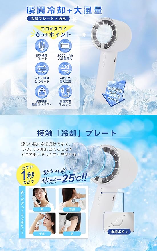 ✅【1台2役のハンディクーラー】 冷却+送風のW機能で、汗ばむ夏も快適に。全10モード(冷却5段階+送風5段階)で自由に調整可能。冷感プレート 6枚羽根で強力送風、体感温度を一気に下げてくれます。