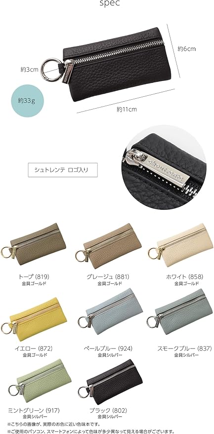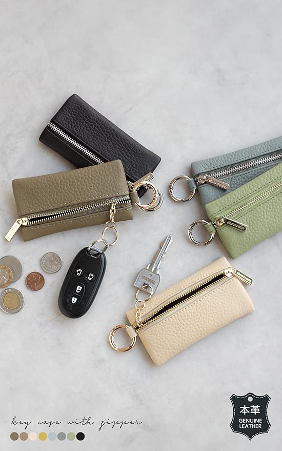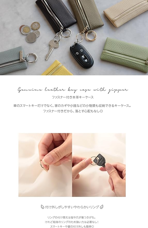 車のスマートキーだけでなく、家のカギや小銭などの小物類も収納できるキーケース。 ファスナー付きだから、落とす心配もなし! 付け外しがしやすいやわらかいリング。 指や爪が傷つきやすいリングの付け替えも、細身のリングなので強い力は必要なし! スマートキーや鍵の付け外しも簡単! 高級感あふれる本革素材で思わず持ち運びたくなるアイテム。 カラー展開は全8カラー。男女問わず使用いただけるアイテムです。