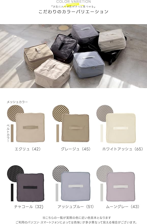 【豊富な6色カラーバリエーション】 エクリュ、グレージュ、ホワイトアッシュ、チャコール、アッシュブルー、ムーングレーの6色展開。インテリアに馴染むナチュラルカラーで、お部屋の雰囲気に合わせて選べます。重さはLサイズ618g、XLサイズ835gと軽量設計