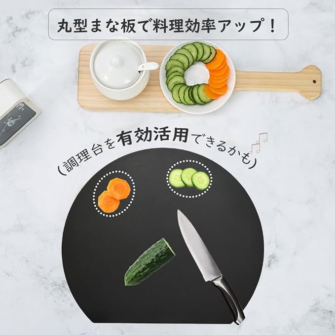 【耐熱エラストマー まな板・丸いまな板】傷もつきにくく水はけのよい素材 100%熱可塑性エラストマーを採用!木製のまな板のようなやわらかな刃あたりで、食材がすべりにくく刃がしっかりと入り込むので、お肉やお魚、カボチャなどの硬い食材もしっかり楽に切ることができます。切った食材を移動させながら効率良く作業ができ、切った食材をまな板の上に置いたまま他の食材をカットすることもできます。面積が広い丸形だから、カットした食材を並べて置いてお皿いらず!
