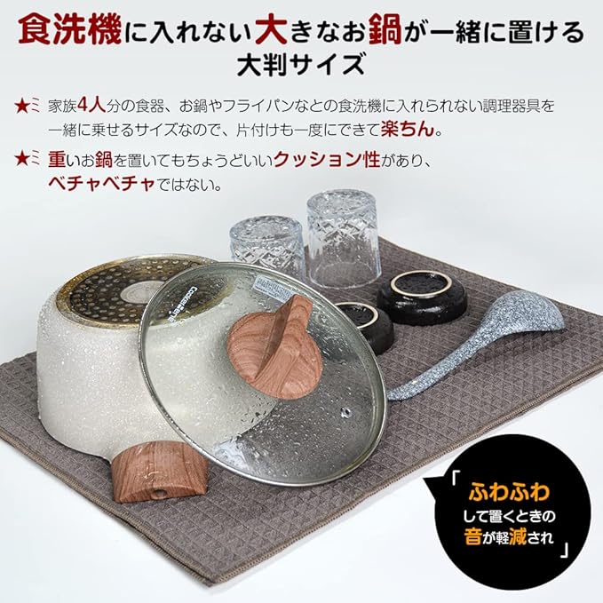 ③【大きめ調理器具の福音】大きな鍋やフライパンとか洗った後、食洗機にも入れられないし、水切りかごにも入れられない場合もよくあるでしょう、一枚の水切りタオルを敷きておけばたくさん洗った食器や鍋を乗せてもベチャベチャになりません。それに、水切りかごと違って広げたり折りたたんだり大きさも調整できるので使いやすいです。