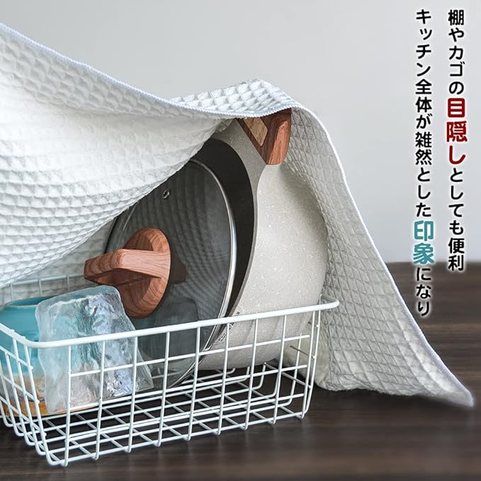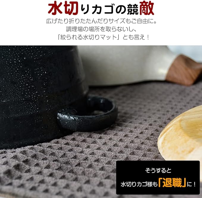 ②【水切りかごの代わりに】シンク周りの空間が最大限に節約できるような水切りタオルを目指して、この大判サイズの水切りタオルがやっと誕生しました。即、洗濯できて、水切りカゴのように定期的な掃除をしなくてもいいし、それに、キッチンの場所も取らないし、キッチンのスペースもかなり広くなれる吸水水切りふきんです。