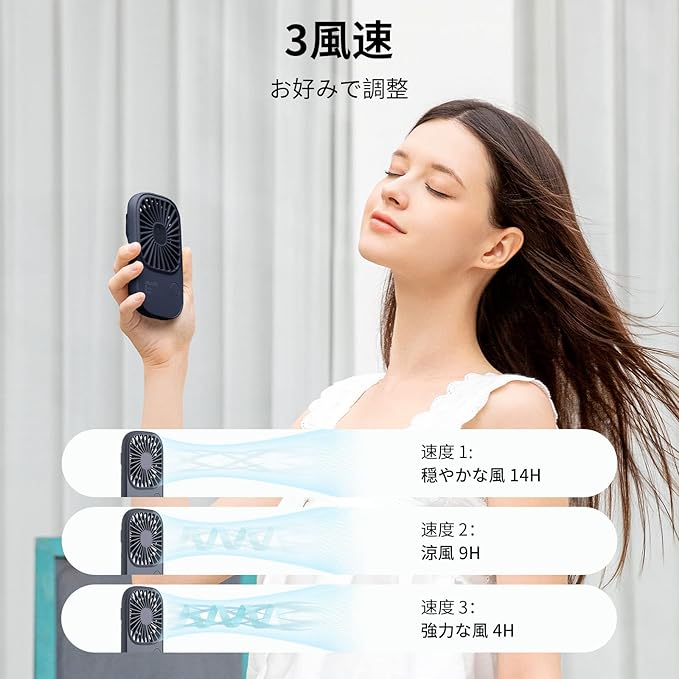 【風速3段階調節】このハンディ扇風機は風速3段階調節が可能です,電源ボタンを押すだけで簡単に3種類の風感を切り替えられます。 弱風は約14時間連続運転、中風は約9時間連続運転、強風は約4時間連続運転です。 (二重に保護するためのセーフティーロックが付属しています。 セーフティーロックを使用する場合は、セーフティーロック解除<ダイヤル「オン」>後、電源ボタンを押してファンをオンにすることを忘れないでください)