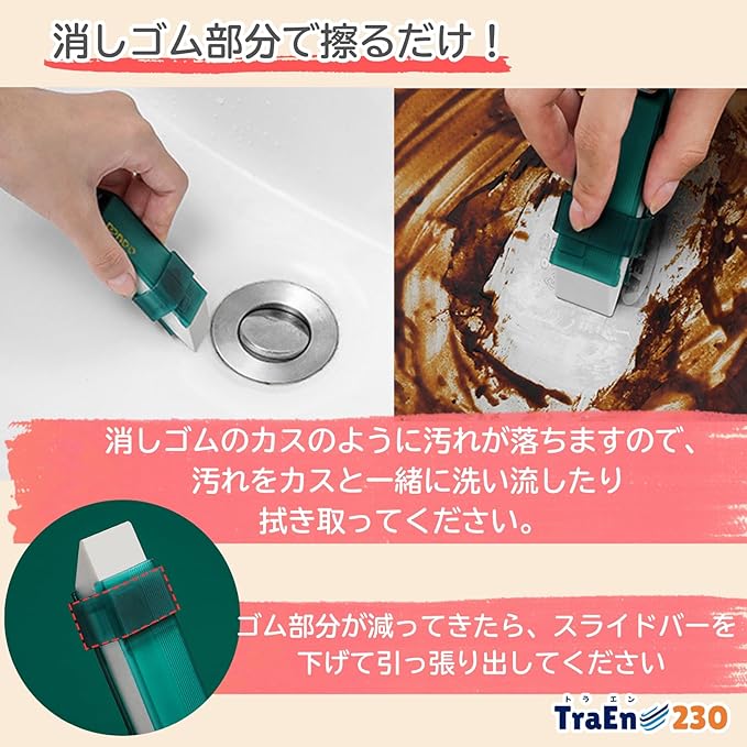 ✔︎消しゴム部分で擦るだけ!消しゴムのカスのように汚れが落ちますので、汚れをカスと一緒に洗い流したり拭き取ってください。✔︎ゴム部分が減ってきたら、スライドバーを下げて引っ張り出して下さい。