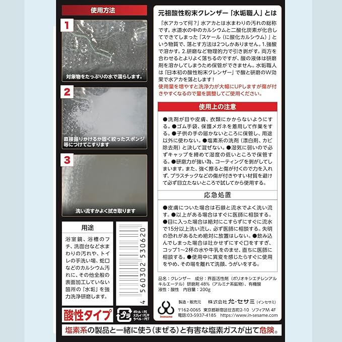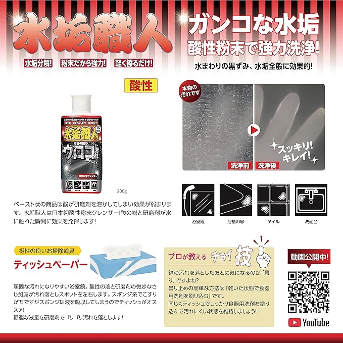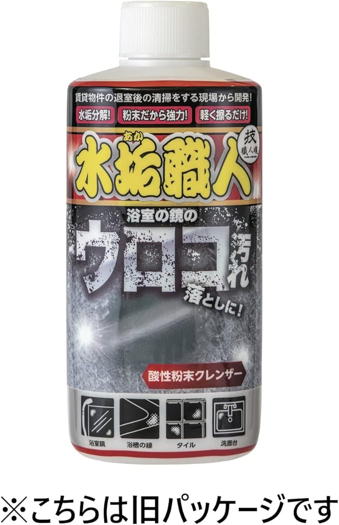 【間違っている水アカの知識・・・】水アカと皆さんが呼んでいる汚れは実は3種類に分けられます。マグネシウム系やカルシウム系、そして日々の生活汚れ系。それぞれ汚れが違うのですが汚れの性質がわかってないHOTやネット有識者は「水アカ(水の汚れ)」という総称で包括して表現してしまっているのです。当然使う洗剤はすべて別なのです! それを一つの洗剤でどうにかしようとしているので簡単に落ちないんですね。【浴室の鏡・・なんであんなに汚れるの?】そもそも浴室の鏡のガラスばかりがなんで特にひどい汚れになるんでしょう?これって実に面白い原因があります。POINT!:鏡表面はガラスでできています。実は「ガラスって果てしなく個体に近い液体」なんです! ( д )びっくりですよね?液体なんです! なので、水回りの汚れと同じ水の分子を持っている鏡表面のガラスが同じ分子同士で結合してしまって強固に結びつき、ガッチガチになるのです。なので、ただでさえ不溶性(水に溶けない)性質がある水回りの汚れ。分子同士ががっちり手を組んでしまったらもう頑固すぎてお手上げです(><)。【★汚れの正体はスケール! 】この汚れは水道水の中のカルシウムと空気中の二酸化炭素が化合してできた汚れ、「尼酸化カルシウム(スケールともいう)です。化合してカルシウム汚れになっていてさらにガラスの分子と結合している上に、水質が良い「温泉、海の近く、湧き水がある」など水質に左右されます。日本は軟水といってカルシウムやミネラル、マグネシウムが少ないので、硬水の海外に比べたらすぐにひどくなりませんが厄介なのには変わりません。【お掃除のプロはどうやって落としてるの?】プロの施工方法は簡単・・・1,酸で溶かす。2,研磨剤で引っ剥がす。それだけです。液体の酸に研磨剤を混ぜてペースト状にして、ポリッシャーという機械で磨くのです。【机上の空論洗剤の罠】「なるほど・・プロは酸の液体に研磨剤を入れて使うのか・・・よし! 商品化だ! 」と言われて作られた洗剤10年以上前にありました。そしてその洗剤がTVでのヒットにより有名になり、こぞって各HOTはそのアイデアをパクって商品化したのです。えっとですね・・・プロが使うのと商品化するための越えないとならないハードルってちがうんですよ・・・【こぞって失敗商品が多発】酸の液に研磨剤を入れて商品を製造し、それを店頭に並べておくわけです。できたてホヤホヤの商品ならよいですけど時間が立つと「酸が研磨剤を溶かしてしまい劣化した商品になってしまう」のです。それをお客様が使うと落ちない個体が多く出てくるのです。【元祖! 酸性粉末クレンザー! 水垢職人! 】酸性の粉末が水に触れて初めて酸性の液体になります。そこに混ぜてあった全く劣化していない研磨剤が加わることで、水アカと鏡の分子の結合部分を溶かして引っ剥がします! また、通常の洗剤であれば、量を増やしてもさほど洗浄力は変わらないのですが、水垢職人は使用量を増やせば増やすほど洗浄力が比例していくので汚れに応じて使う量を変えることで調整が可能です! ★使用するときはスポンジなどでゴシゴシはせず(液になった酸が吸収されてしまいます)ティッシュなどを丸めて500円玉大で円を描くように15回ほど。「シュルシュルシュル・・・」という擦り音が消えれば水アカの分子は引っ剥がされてキレイに落ちています。しっかり除去でくるので浴室鏡クリーナーにありがちな「すぐに汚れる」「なんとなくくすんで残る」などの中途半端な洗浄による洗浄ムラも残しません!
