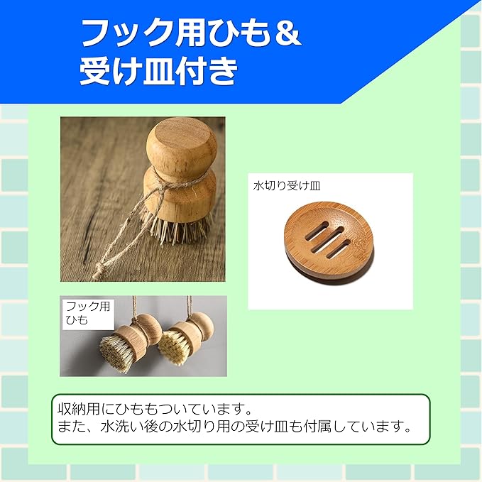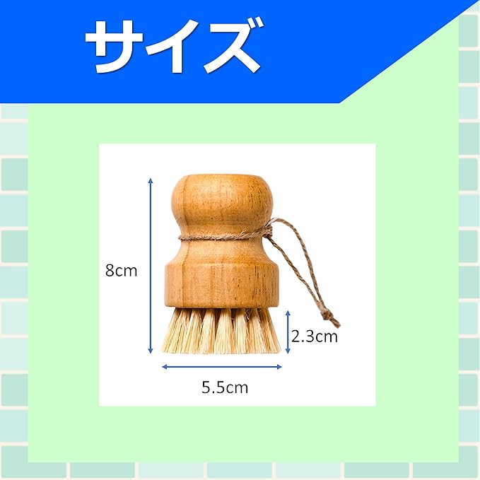 天然植物繊維の強いコシでしっかり洗浄 焦げつきや油汚れもスムーズに落とせる、固めブラシ構造。鉄フライパンや中華鍋に最適です。 プラスチック不使用のエコ設計 天然植物繊維で構成され、地球環境にやさしい持続可能な素材です。 専用の水切り受け皿付きで衛生的 使用後はそのまま立てて乾燥。水が切れてカビやぬめりを防ぎ、清潔に保てます。 鍋や皿を傷つけにくく、しっかり洗える 頑丈な繊維でこびりついた汚れもガシガシ洗えて、食器にもやさしい仕様。 ️ シンク周りに置きやすいシンプル設計 受け皿とブラシがセットになっており、見た目もスッキリ。出しっぱなしでも気になりません。 使用方法: スクラビングブラシを水に浸して、洗剤を適量つけます。 頑固な汚れのある部分をブラシでこすり洗いします。 使用後は、ブラシを水で洗い流し、ひもを使って乾燥させます。 サイズ: サイズ: 8 cm x 6 cm x 8 cm 素材: サイザル繊維など、高品質で耐久性のある素材を使用しています。 メンテナンス: 使用後は水で洗い流し、しっかりと乾燥させてください。定期的に清潔を保つことで、長く快適に使用できます。 注意事項: 高温になる場所や火気の近くに保管しないでください。 子供の手の届かない場所に保管してください。 強くこすりすぎると、デリケートな表面に傷がつくことがありますので、注意して使用してください。