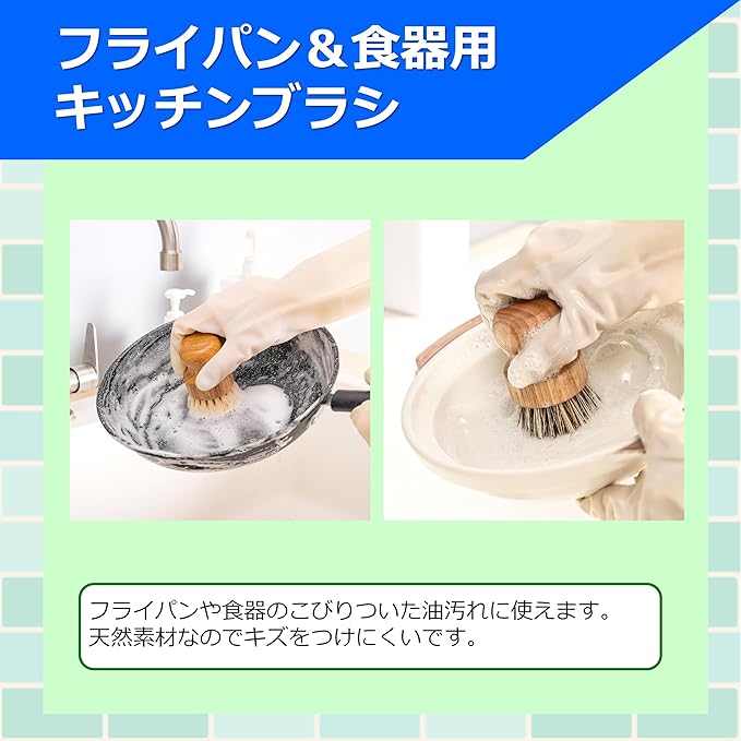 天然植物繊維の強いコシでしっかり洗浄 焦げつきや油汚れもスムーズに落とせる、固めブラシ構造。鉄フライパンや中華鍋に最適です。