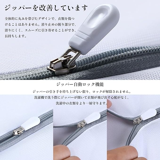 【独自の自動ロックファスナーでしっかり保護】 自動ロック式ファスナーを採用しており、洗濯機の高速回転や強い引っ張りにも関わらずしっかりと閉じ、開くことはありません。また、ファスナーには保護カバーを追加し、他の衣類との摩擦を防いで衣類やファスナーの寿命を延ばします。