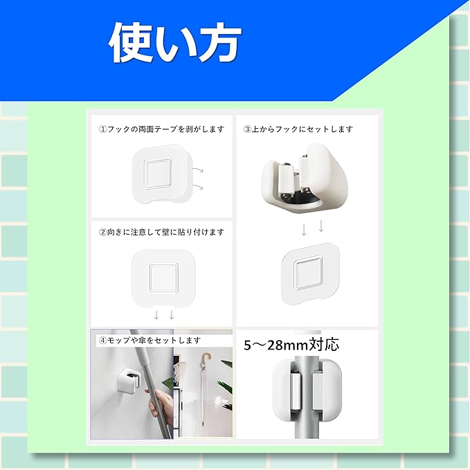 【 簡単取り付け、強力な粘着力で安心 】 工具不要で、壁にペタッと貼り付けるだけ!強力な粘着テープがしっかり固定し、掃除用具を安全に支えます。耐荷重も優れているため、モップやホウキだけでなく、キッチン用具や傘なども掛けられる多用途なホルダーです。