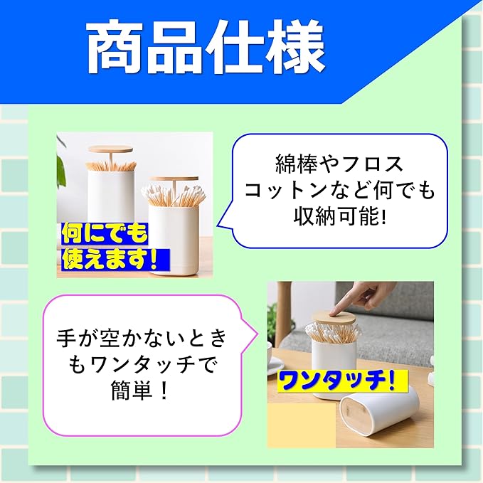 【✨ワンタッチで便利&衛生的✨】押すだけでスッと取り出せる自動式つまようじ入れ。ポップアップ式でフタがしっかり閉まり、ホコリや汚れから爪楊枝や綿棒を守ります。コンパクトサイズでキッチン、ダイニング、洗面所にもぴったり。おしゃれなデザインで、日常使いにスタイリッシュさをプラスするアイテムです。 【 仕切り付きで4WAY収納 】綿棒ケースとしても活躍する、仕切り付きの便利設計。つまようじと綿棒、またはピックなどの小物を分けて収納できます。多機能で実用的な爪楊枝ケースは、整理整頓がしやすく、どこに置いてもスッキリ見えるのが魅力です。 【 自動ポップアップ式で簡単操作 】上部を軽く押すだけで、フタが開き中身がサッと取り出せる便利構造。ワンタッチで片手でも操作可能なため、調理中や手がふさがっている時でもスムーズに使用できます。忙しいキッチンにも最適な自動式つまようじ入れです。 【 おしゃれなデザインでインテリアに馴染む 】北欧風やシンプルモダンなデザインが特徴。洗練されたカラーとフォルムで、リビングやダイニングテーブル上でも違和感なく馴染みます。実用性だけでなく、見た目にもこだわった楊枝入れです。 【 お手入れ簡単&清潔に保てる 】フタ付きで中身を清潔に保ちながら、取り外し可能なパーツでお手入れも簡単。毎日使うものだからこそ、清潔さをキープできる仕様がうれしいポイント。爪楊枝ケースとしてだけでなく、コットンやクリップなどの収納にも◎