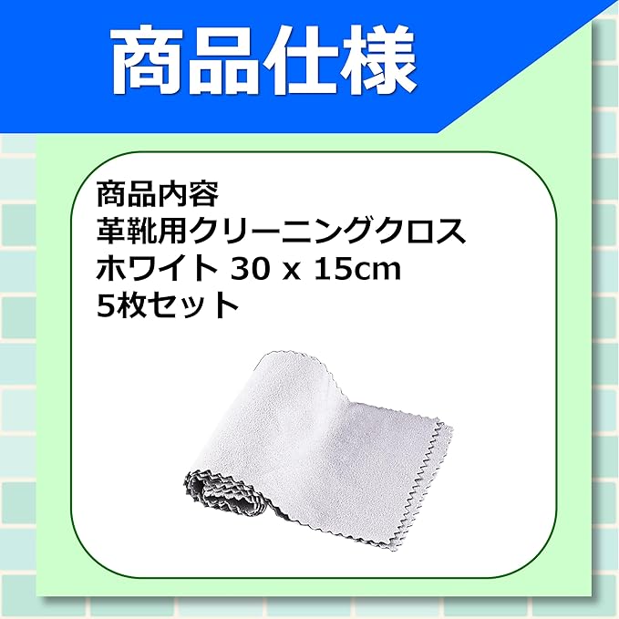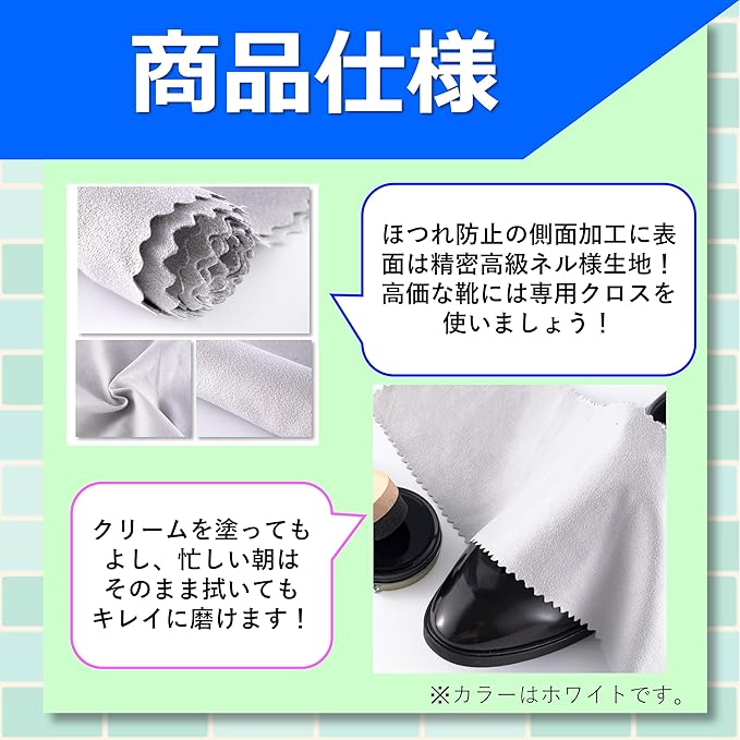 【 革靴のお手入れに最適なクロスセット 】 大切な革靴を美しく保つための靴磨きクロス5枚セット!柔らかなネル生地を使用し、靴クリームやワックスの塗布、仕上げ磨きに最適。革に優しくなじみ、ムラなく均一に磨けるので、靴本来のツヤを引き出します。 【✨高品質なネル生地で優しく磨ける✨】 細かい繊維のネル生地を採用し、デリケートな革製品にも安心して使用可能。ホコリを落としながら、靴クリームやワックスを均一に塗布。仕上げ磨きでは余分な油分を取り除き、革の美しい光沢を引き出します。 【 使いやすいサイズ感&5枚セット 】 1枚ずつ手に持ちやすいサイズで、靴の細かい部分までしっかり磨けます。5枚セットなので、用途別に使い分けができ、長期間使えるのも魅力。靴磨き初心者からプロまで満足のいく使い心地! 【 持ち運びやすく、どこでも手軽にケア 】 軽量でコンパクトなクロスなので、自宅だけでなく、出張や旅行先でも便利に使用可能。日々のちょっとしたメンテナンスから本格的な靴磨きまで、これ一つで対応できます。 【 革靴・バッグ・財布・家具まで幅広く活躍 】 靴磨きだけでなく、レザーバッグや財布、ソファなどのレザー製品のケアにも最適。革製品を長持ちさせるために欠かせないアイテムで、プレゼントやギフトにもおすすめです!