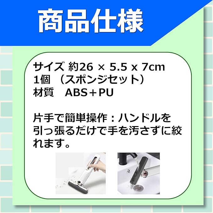 【 手洗い不要!簡単お手入れ 】 モップ部分は取り外して水洗いが可能で、汚れが気になる場合でも手を汚さず清潔をキープ。吸水性の高いスポンジ素材を使用し、水分や汚れをしっかりキャッチ。水拭き後もサッと乾燥するので、繰り返し快適にお使いいただけます。お掃除の効率が大幅アップする便利アイテムです!