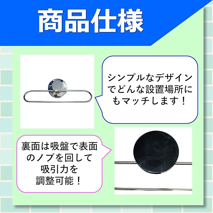 【強力吸着&吸引力調整ノブ付き】 吸盤は吸引ノブでしっかり固定・調整可能。壁面に強力吸着し、ずれ落ちの心配なし。 ️【工具不要の簡単取り付け】 ネジ・穴あけ不要。ワンタッチで設置でき、賃貸やタイル壁にも安心です。 【水回りでも使える防水設計】 キッチン・浴室・洗面所など水に強く、濡れた手でも快適に使えます。 【インテリアになじむシンプルデザイン】 生活感を抑えたミニマル設計。ホワイト・グレーなど清潔感あるカラーリング。 【1個セット・省スペース設計】 コンパクトでもしっかり掛けられるリング型。限られた空間でも活躍します。