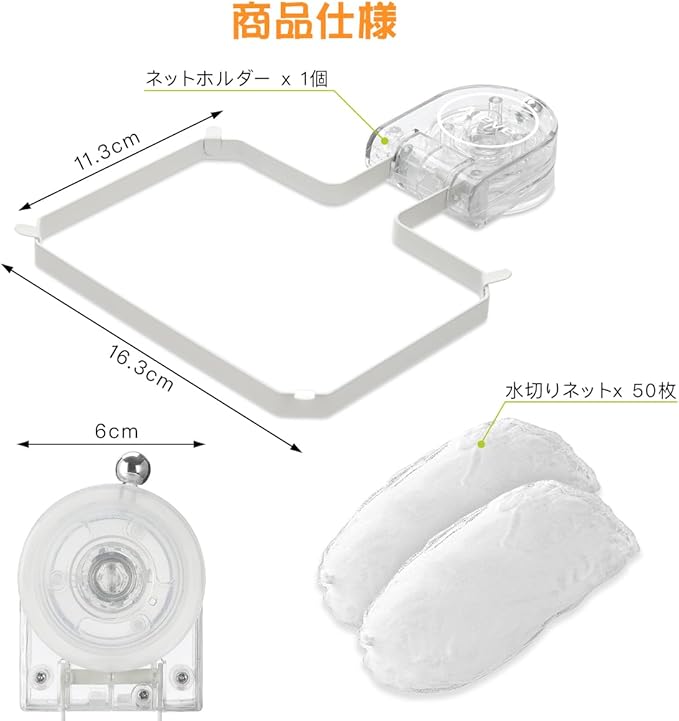 【商品仕様】パッケージ内容:水切りネットホルダー x 1個、水切りネットx 50枚。サイズ:約16.3 x 21.6 x 2.6 cm、枠のサイズ: 約16.3 x 11.3cm。※ご注意:パッケージは更新中で、一部の在庫はまだクラフト紙パックで梱包されています。
