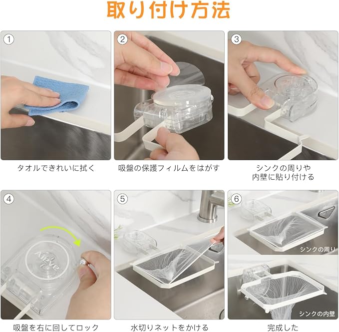 Aieve 三角コーナー いらず 強力吸盤 水切りネットホルダー サンカクコーナー シンク ゴミ受け 生ゴミ入れ 粘着吸盤 折り畳み 省スペース 浮かせる キッチン シンク 台所 水切りネット50枚付き ホワイト