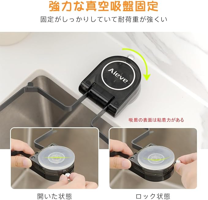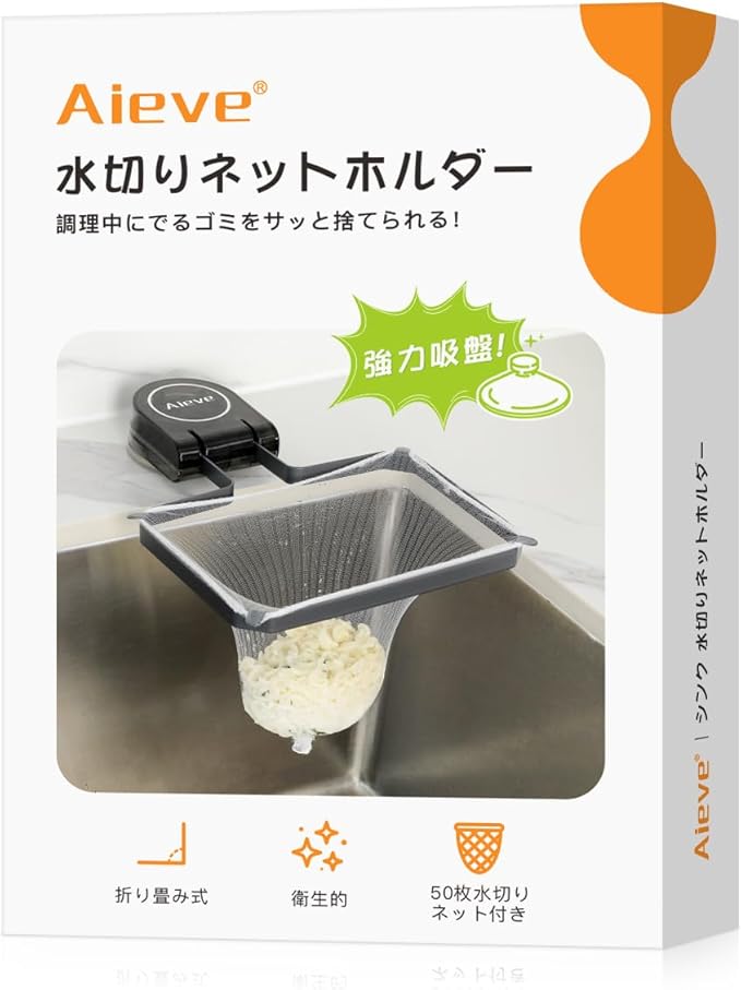 Aieve 三角コーナー いらず 強力吸盤 水切りネットホルダー サンカクコーナー シンク ゴミ受け 生ゴミ入れ 粘着吸盤 折り畳み 省スペース 浮かせる キッチン シンク 台所 水切りネット50枚付き ブラック