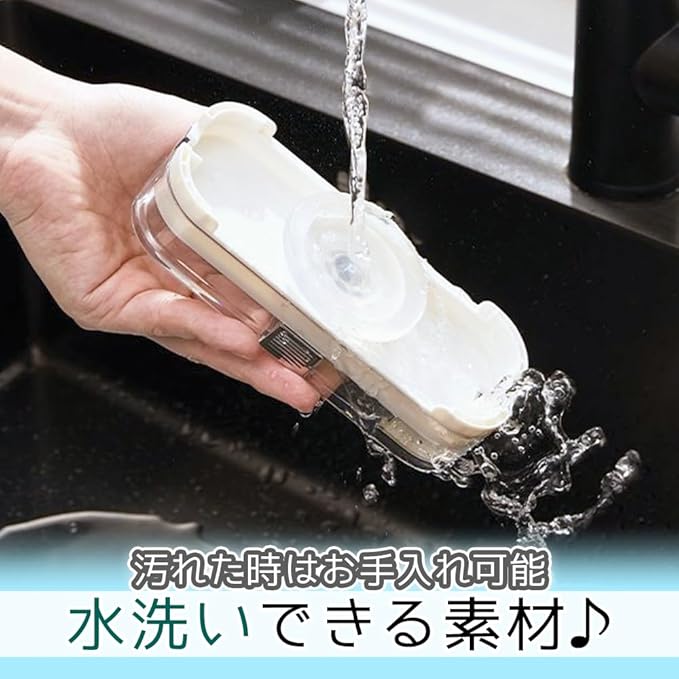 シンク脇に吸盤を貼り付けてレバーを下ろすと真空状態になりピタッと吸着します。フレームの接着面は吸盤式により何度でも貼り直し可能です。未使用時はフレームを折り畳むと布巾掛けとしてもご使用いただけます。