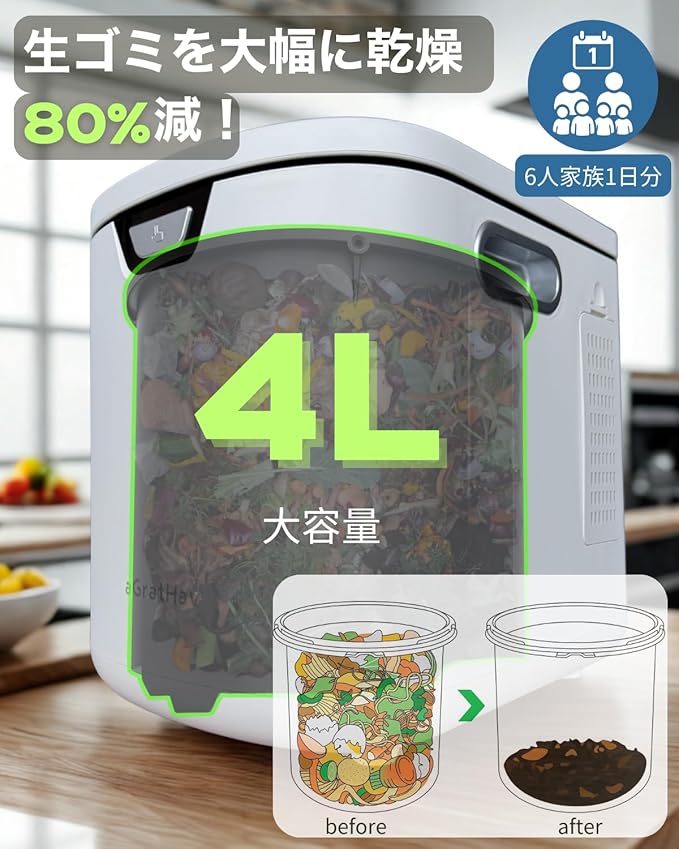 【コンパクト設計が大容量4L】:4L大容量の本体は設置場所を選ばずにすっきり収納できます。。家族向けのスペース節約設計で、(6人家族の1日分の生ごみを削減できます。もっと便利な日常生活を!