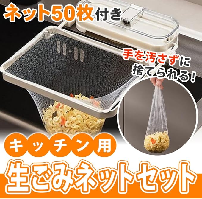 生ゴミネットが50枚付属しており、別途購入しなくてもお手元に届き次第すぐにお使いいただけます。生ゴミをシンクに直接触れることなく空中に浮かせられるため、ヌメりやカビの発生を抑えられるところも嬉しいポイントです。