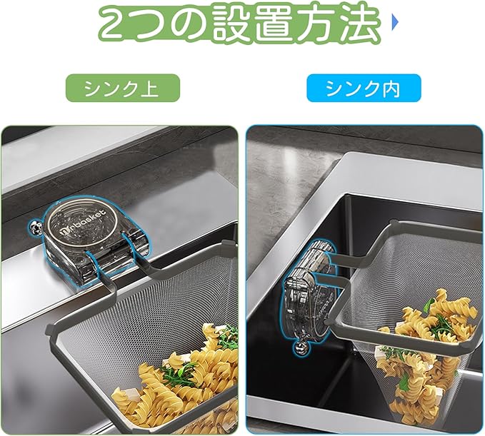 【シンクの縁または側壁の 2 通りの取り付け方式に対応】① シンクの上縁に掛けて使用 ② シンクの側壁に吸盤で固定して使用 —— 2 種類の取り付け方法から、ご自身のキッチンのレイアウトや使用習慣に合わせて自由に選べます。