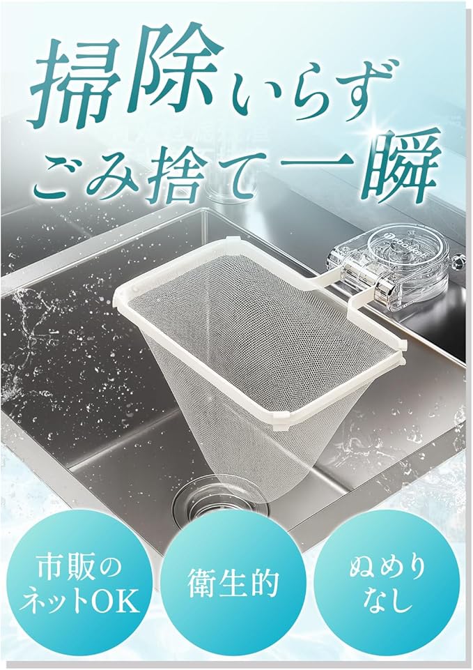 【水切りネット対応】 市販のストッキングタイプの水切りネットに対応しているから、専用品を買い続ける必要なし。ホルダーにネットをかぶせるだけで、生ゴミの処理が簡単&衛生的。経済的でエコにも配慮。日々のキッチン作業の負担を軽減します。